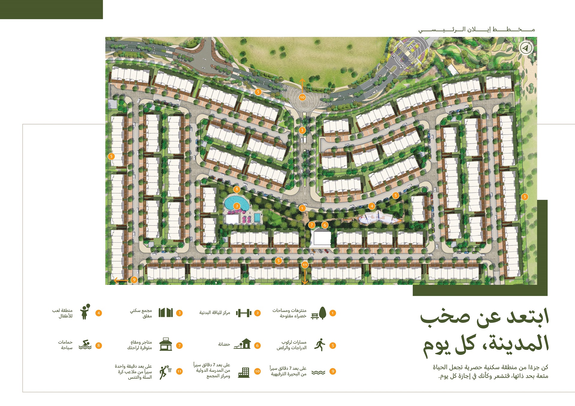 مع مساحة تزيد عن 3 ملايين متر مربع، يوفر هذا المشروع مجموعة أحياء سكنية تتميز بفيلات ومنازل وشقق فخمة يمكن التنقل بينها سيراً على الأقدام. وهي متصلة بمسارات ومساحات طبيعية مفتوحة وحدائق عامة. يضم المشروع كذلك